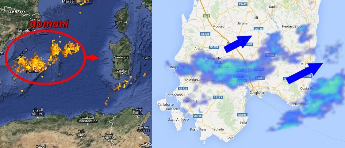 previsione piogge sardegna 16 hg 360x180 - Rovesci in diretta - Linea temporalesca sfiora le coste meridionali