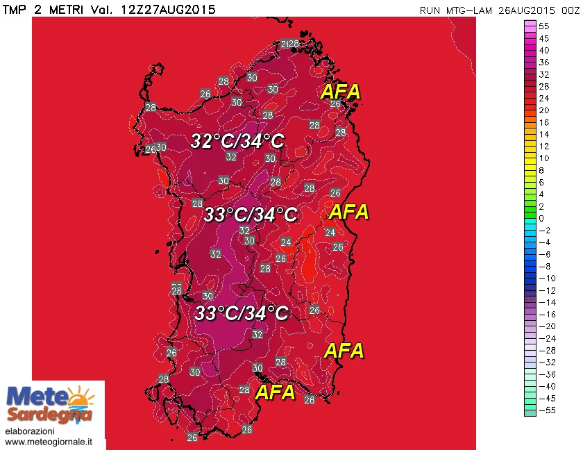 Caldo inevitabilmente in aumento sia per quanto riguarda le temperature effettive registrate dai termometri sia per quanto riguarda le percepite dal nostro corpo a causa degli elevati tassi di umidità, ma andiamo con ordine. Domani le temperature effettive più alte le attendiamo sui settori settentrionali ed occidentali dell’isola, dove diffusamente i termometri segneranno valori superiori ai 30°C/31°C con picchi fino a 33°C/34°C nella piana del Chilivani, zone interne dell’Oristanese, Marghine, Goceano, piana di Ottana, piana del Cixerri e medio alto Campidano. Sui settori orientali, specialmente costieri, e golfo degli Angeli attendiamo temperature inferiori e comprese tra 27°C e 30°C ma gli elevati tassi di umidità innalzeranno l’indice di calore fino a 36°C/37°C.