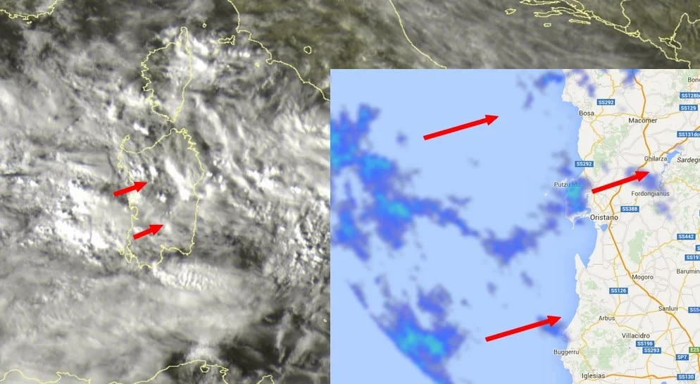 I rovesci prima analizzati e localizzati sul Mare di Sardegna attraverso il nostro servizio di nowcast/diretta meteo sono ormai in procinto di abbordare le coste, ormai distanti solo una cinquantina di chilometri, e vengono ben individuati dal radar ARPAS. Va detto che non si tratterà di fenomenologia intensa, tuttavia piogge moderate sono attese nelle prossime ore tra alto Iglesiente, alto Campidano, Oristanese e Sassarese. I nuclei evolveranno poi, perdendo gradualmente intensità, verso levante pertanto nelle zone interne ci attendiamo al più qualche leggero piovasco.